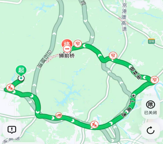 方案一:縣道X308獅前路南——省道S381山前旅游大道——廣連高速——大廣高速——銀林街——石吉街——檀香山街——大窿坳路——縣道X308獅前路北(約35公里,46分鐘)