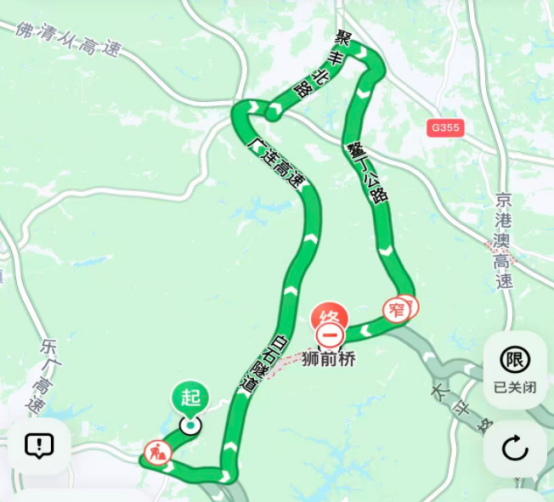 方案二:縣道X308獅前路南——省道S381山前旅游大道——廣連高速——佛清從高速——聚豐北路——鰲丁公路——縣道X308獅前路北(約43公里,50分鐘)