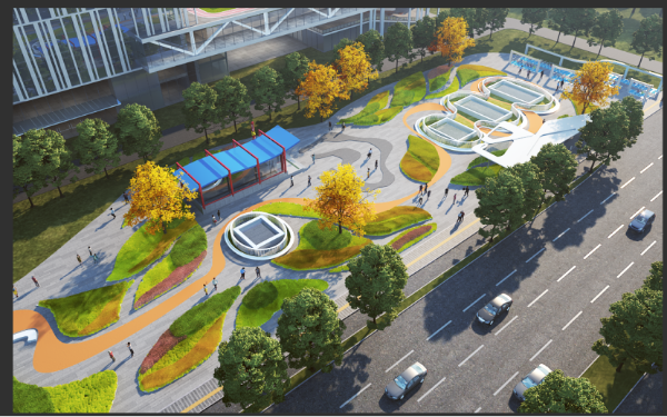 廣花城際鳳凰南路站共設5個出入口,3組風亭,位于鳳凰南路與永利路交叉口,地處花都區科創制造區,也是花都湖景觀風貌綠心的重要節點。為確保車站出入口、風亭等設施在風格、色調上與周邊城市風貌協調統一,縫合城市空間,在審批過程中,該局引入場地設計理念: