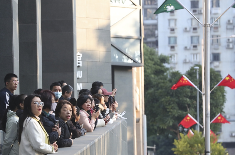 2024年12月20日,澳門特別行政區政府隆重舉行升旗儀式,慶祝澳門回歸祖國25周年。這是人們在觀看升旗儀式。