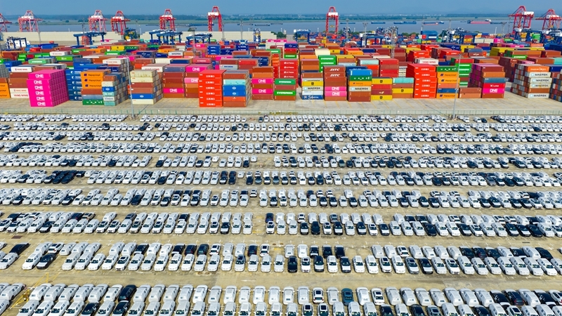 2025年10月4日在江蘇省港口集團南京港龍潭港區拍攝的準備裝船出口的汽車(無人機照片)。