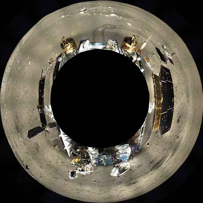 這是嫦娥三號地形地貌相機拍攝的著陸器周邊360°范圍的全景鑲嵌影像圖,采用方位投影方式表達(2013年12月17日至12月18日攝)。新華社發