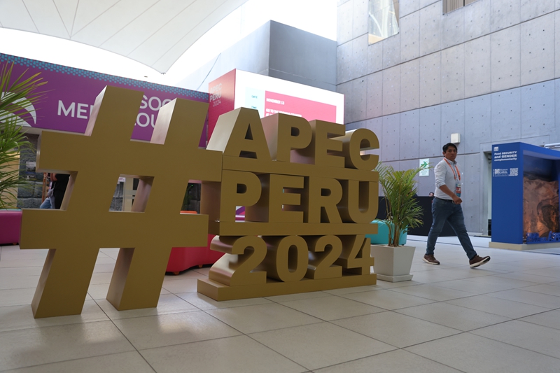 11月13日,人們從秘魯首都利馬會(huì)議中心外的2024年亞太經(jīng)濟(jì)合作組織(APEC)會(huì)議標(biāo)識(shí)前走過。