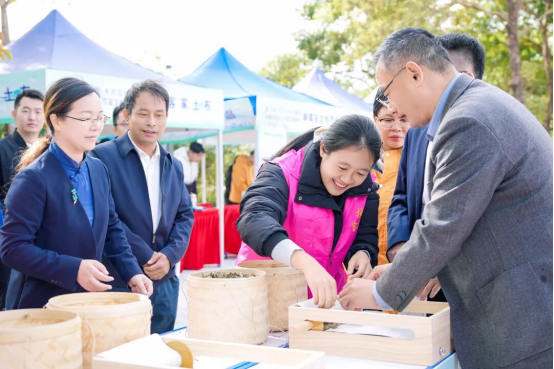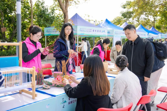 舞臺一側(cè)的文明集市,成為活動現(xiàn)場最具人氣的焦點。十個特色展位依次排開,各具特色:梯面山水農(nóng)產(chǎn)品展現(xiàn)綠色生態(tài)發(fā)展理念,蝴蝶谷文創(chuàng)將傳統(tǒng)工藝與現(xiàn)代設(shè)計相融合,客家嫂手工制品傳承匠心技藝。一位正在制作艾糍的村民笑著說:“我們的手藝能受到這么多人喜愛,感覺特別自豪。”現(xiàn)場還設(shè)有織布、手編等互動體驗區(qū),參觀者通過參與織布、手編制作等互動項目,在實踐體驗中深化對傳統(tǒng)文化的認知。這場集產(chǎn)品展銷、文化體驗、互動交流于一體的文明集市,既是梯面特色產(chǎn)業(yè)創(chuàng)新發(fā)展的生動展示,更是“百千萬工程”建設(shè)成果惠及民間的真實寫照。