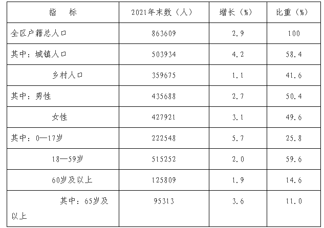 2021年末,全區戶籍人口86.36萬人,比上年增長2.9%,其中,城鎮戶籍人口50.39萬人,鄉村戶籍人口35.97萬人;男女性別比(以女性為100)為101.8,家庭戶均人數3.06人。全年出生人口10107人,出生率12.19‰;死亡人口4025人,死亡率4.86‰;自然增長人口6082人,人口自然增長率7.34‰。