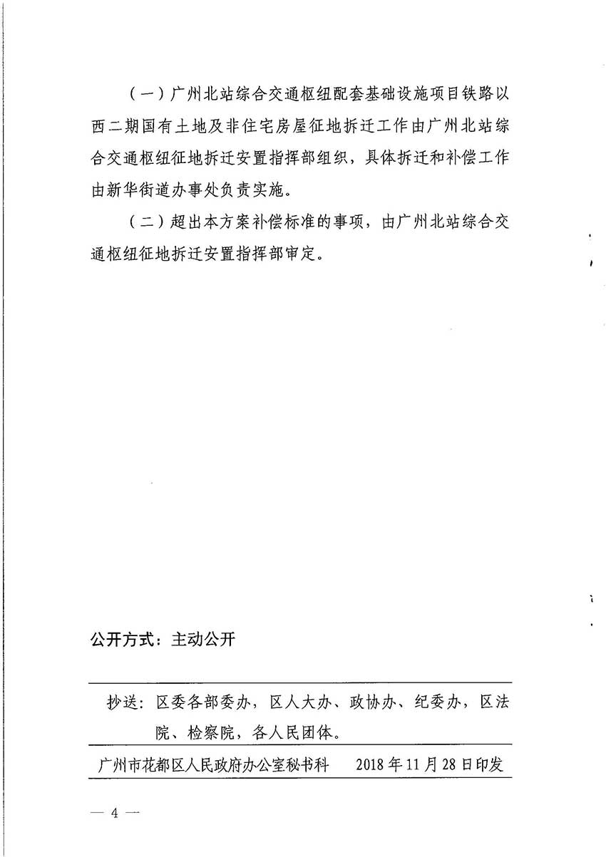 廣州市花都區(qū)人民政府辦公室關(guān)于廣州北站綜合交通樞紐配套基礎(chǔ)設(shè)施項(xiàng)目鐵路以西二期國(guó)有土地及非住宅房屋協(xié)議補(bǔ)償方案的通知【花府辦〔2018〕28號(hào)】