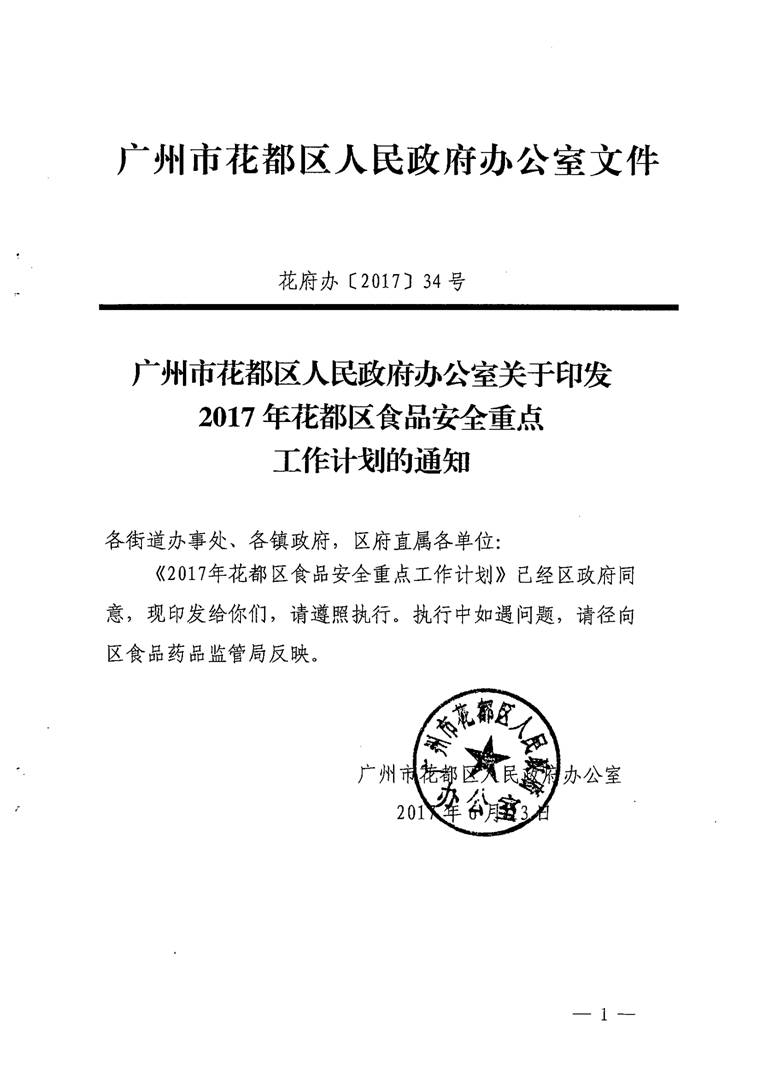 廣州市花都區(qū)人民政府辦公室關(guān)于印發(fā)2017年花都區(qū)食品安全重點(diǎn)工作計(jì)劃的通知【花府辦〔2017〕34號(hào)】(已失效)