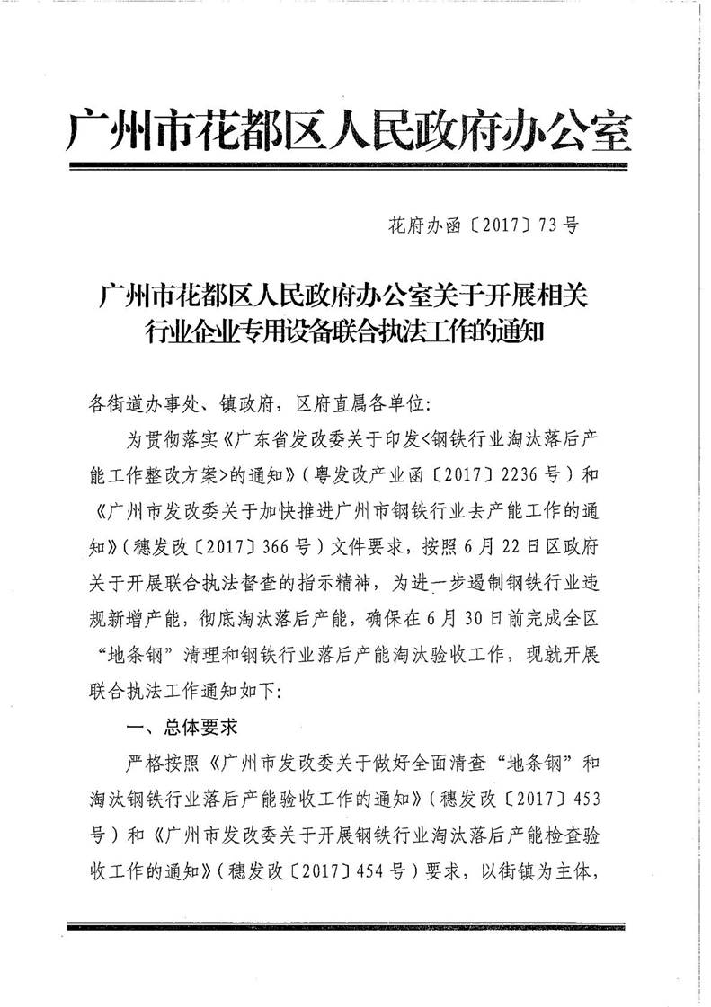 廣州市花都區人民政府辦公室關于開展相關行業企業專用設備聯合執法工作的通知【花府辦函〔2017〕73號】