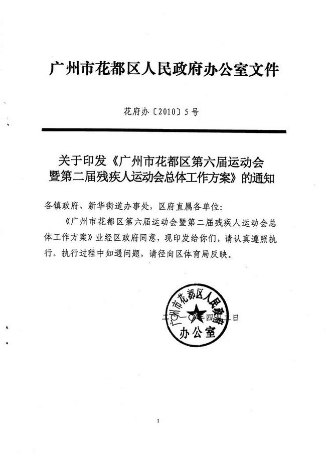 關于印發《廣州市花都區第六屆運動會暨第二屆殘疾人運動會總體工作方案》的通知 【花府辦[2010]5號】