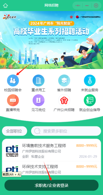 (2)“廣州公共招聘”小程序(操作步驟:進入小程序—點擊求職者/企業登錄—免費注冊、查詢職位等)。