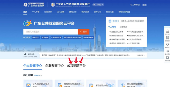 點擊“廣東公共就業服務云平臺”下方服務專區的【公共招聘平臺】,即可進入廣東人社公共招聘服務平臺。