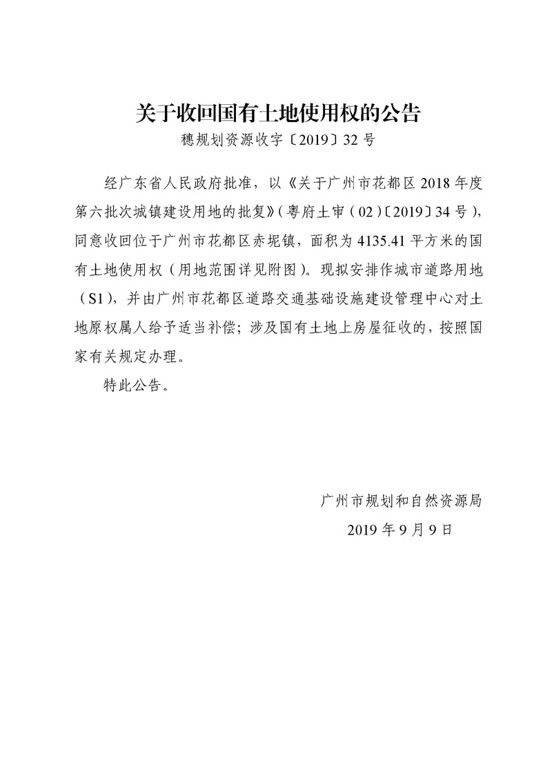 關于收回國有土地使用權的公告(穗規劃資源收字〔2019〕32號)