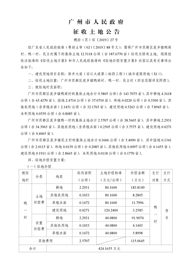 廣州市人民政府征收土地公告--穗府(花)征〔2019〕27號