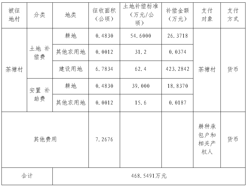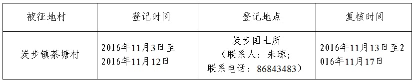 經省人民政府批準(粵國土資(建)字〔2016〕426號文),需將廣州市花都區炭步鎮茶塘村屬下的集體土地7.2676公頃(合109.0140畝)征收為國有土地。現將經依法批準的《征收土地方案》和市人民政府批準的《征地補償安置方案》內容以及有關事項公告如下: