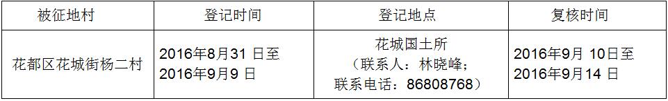 經省人民政府批準(粵國土資(建)字[2016]411號文),需將花都區花城街楊二村屬下的集體用地0.6946公頃(合10.4190畝)征收為國有土地。現將經依法批準的《征收土地方案》和市人民政府批準的《征地補償安置方案》內容和有關事項公告如下: