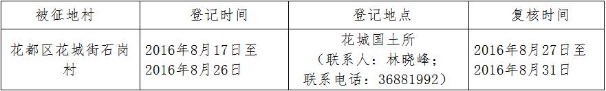 經(jīng)省人民政府批準(zhǔn)(粵國土資(建)字[2016]426號文),需將廣州市花都區(qū)花城街石崗村屬下的集體土地8.7115公頃(合130.6725畝)征收為國有土地?,F(xiàn)將經(jīng)依法批準(zhǔn)的《征收土地方案》和市人民政府批準(zhǔn)的《征地補(bǔ)償安置方案》內(nèi)容和有關(guān)事項(xiàng)公告如下:
