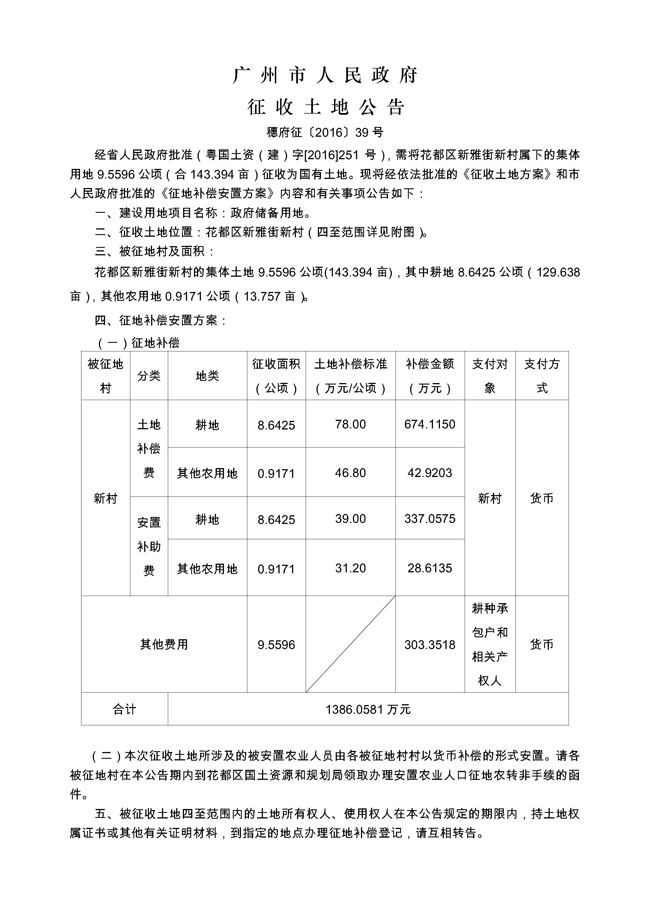 廣州市人民政府征收土地公告——穗府征〔2016〕39號