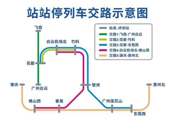 據悉,廣清城際鐵路沿用“站站停+大站快車”公交化運營模式,其中大站快車僅停靠廣州白云站、花都站(廣州北站)、清城站,高峰期增停飛霞站。目前日均開行動車組72列,票價為13元起,“花都站→白云站”方向每天最早經停花都的列車是6點43分,最晚是22點31分。
